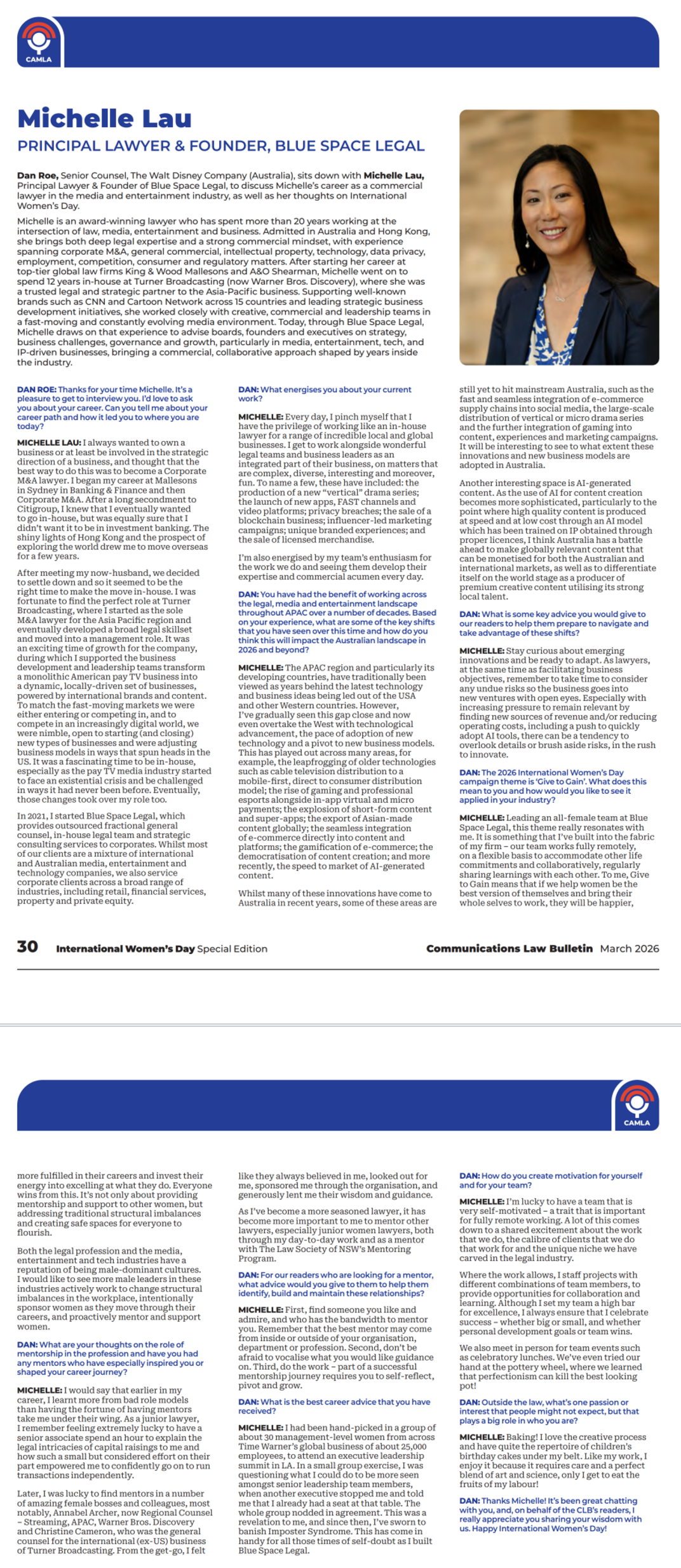 Dan Roe, Senior Counsel, The Walt Disney Company (Australia), sits down with Michelle Lau, Principal Lawyer & Founder of Blue Space Legal, to discuss Michelle's career as a commercial lawyer in the media and entertainment industry, as well as her thoughts on International Women's Day.